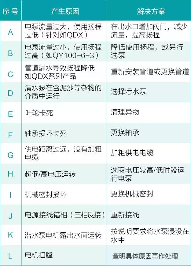 这些是造成水泵“病症”的常见原因,并不是所有原因,实践中处理故障,还因根据具体问题,实际分析,应遵从先外后里的原则,切勿盲目操作。
